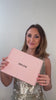 The model is holding ultra boost sticky bra inserts and a white cotton bag featuring the Brelese logo.